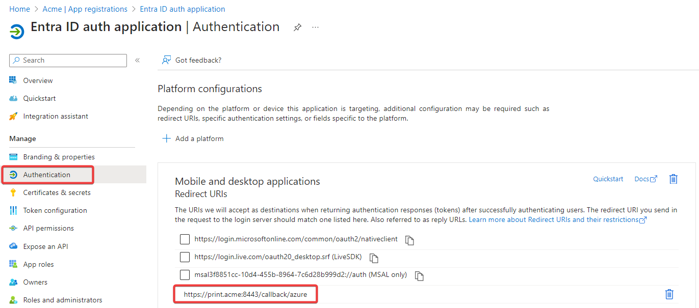 In the Callback domain for custom application drop-down menu, select the domain that matches the one from the Redirect URIs that is already added in Azure application. The pre-selected value represents the domain from the CloudStream Web URL. For adding or updating the Entra Redirect URIs, go back to the Entra ID homepage in Azure portal and click App registrations. Click your application and then click Authentication.