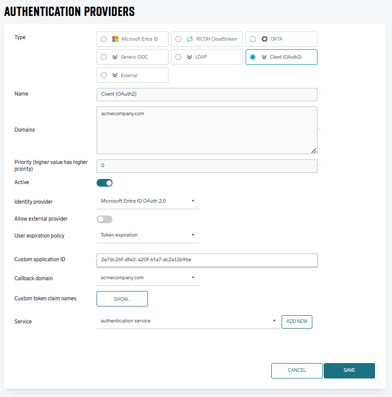 . The domain and the port should be the same as the ones of the CloudStream website URL. For example, if the CloudStream web URL ishttps://print.acme.com:8443,