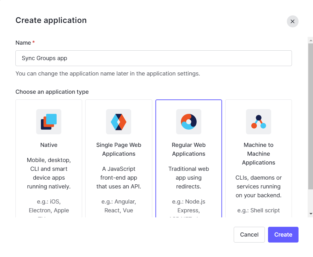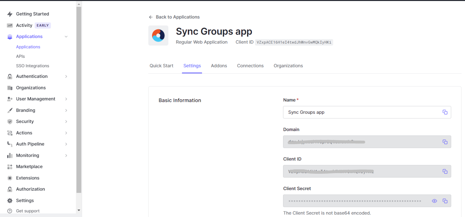To synchronize groups from Auth0, you must create a group synchronization application in the Auth0 identity platform.