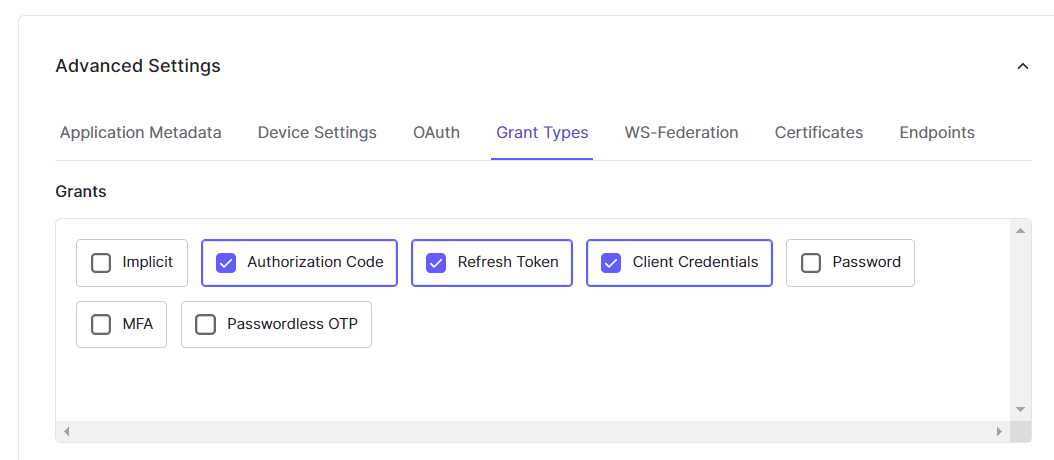 Client Secret – The client secret of the application.Go to Advanced settings > Grant Types.