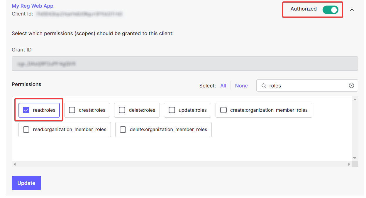 Go to to Machine to Machine Applications tab and find your newly created application. Authorize it, and in Permissions, select read:roles.