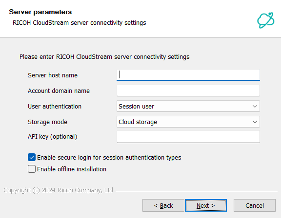 Enable offline installation – install RICOH CloudStream Client without registering or checking server connectivity. Please see this section for details.