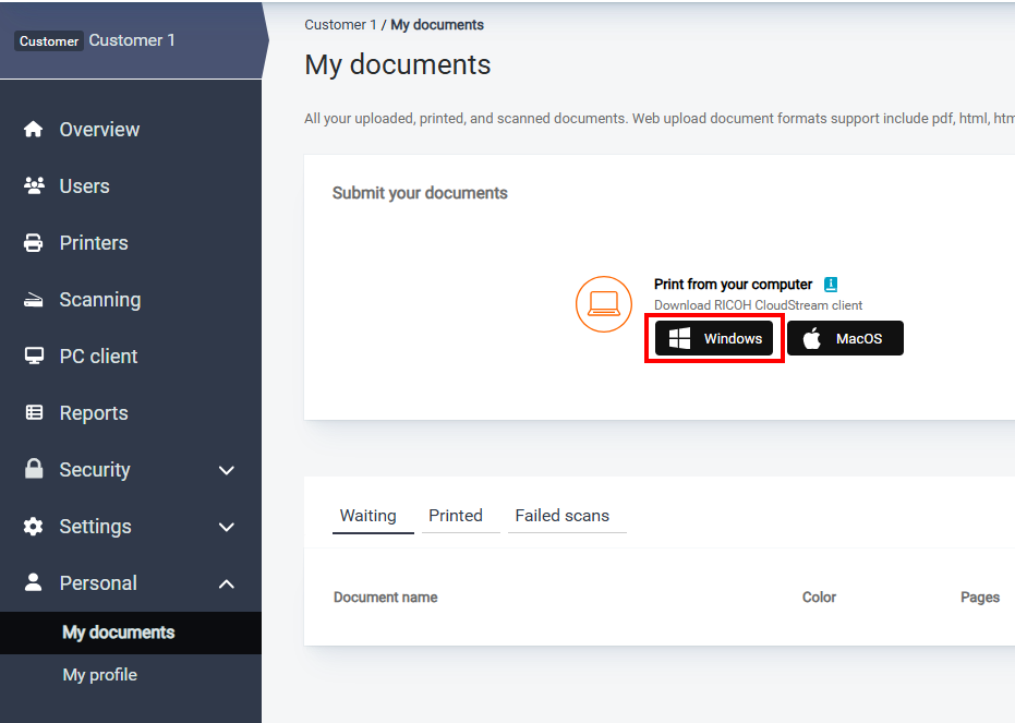 Log in to your Web UI, navigate to Personal > My documents, and select Windows.
