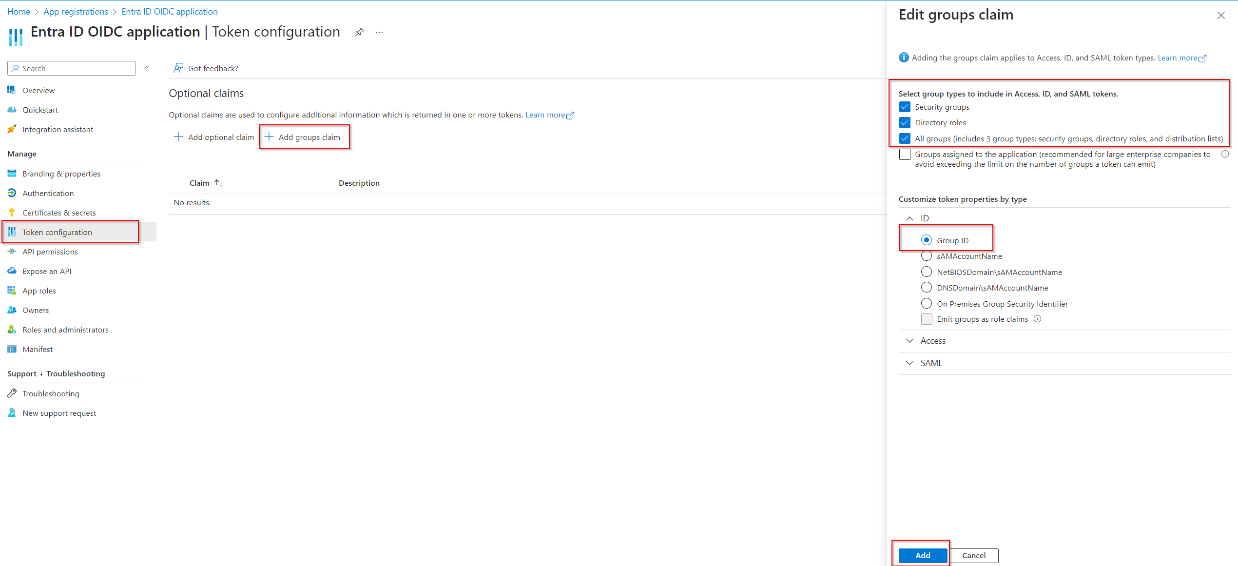 Go to Token configuration, click + Add groups claim, and define the groups that will be part of the users' ID Token. This will be used later in the Access Control configuration in CloudStream.