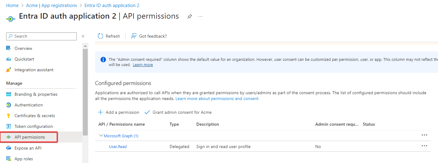 Grant the admin permissions by clicking Grant admin consent for, then click Yes to approve.