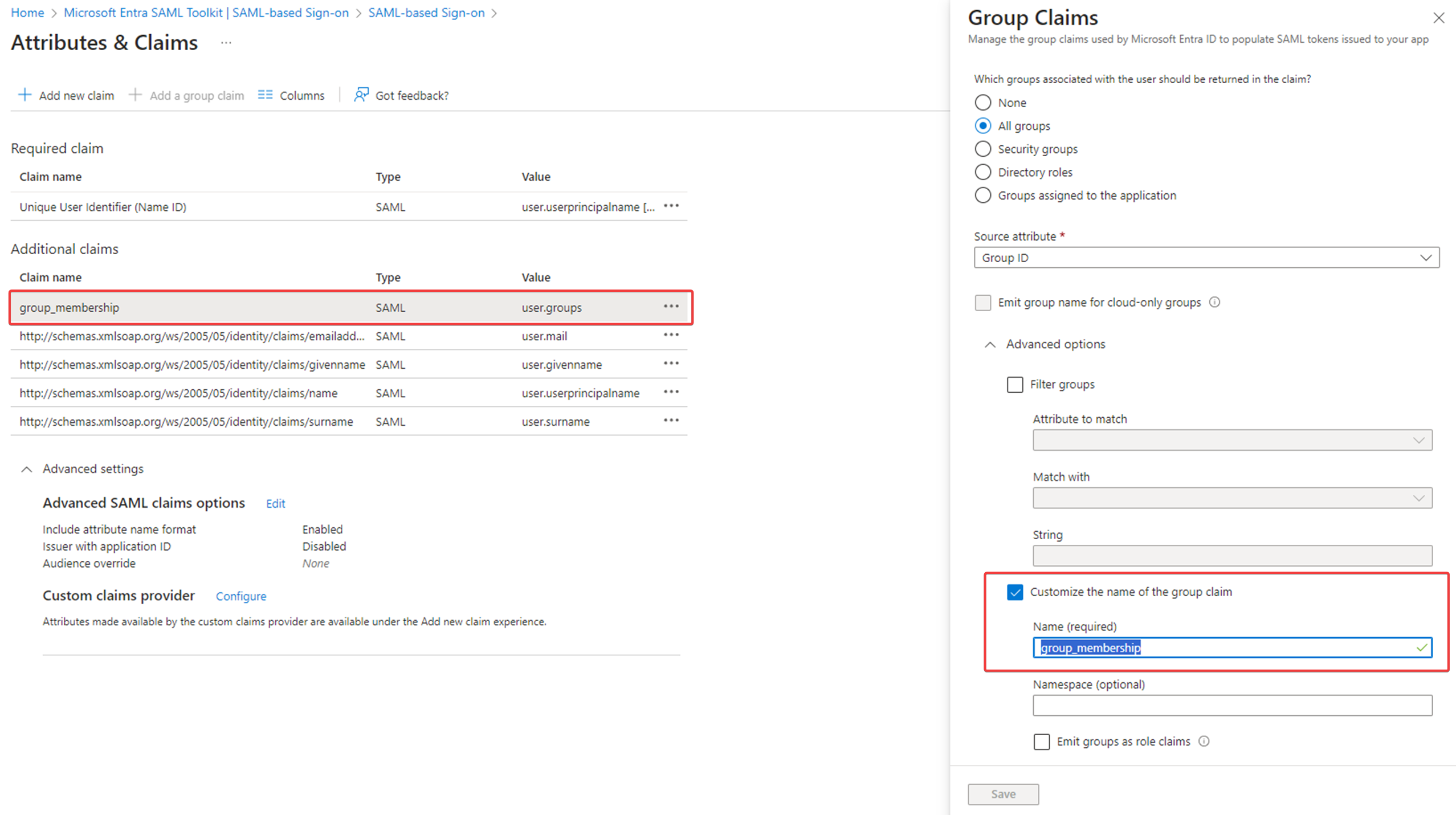 Click the claim with the user.groups value. In the dialog window that will be displayed, select Customize the name of the group claim. Enter the name of the group_membership.