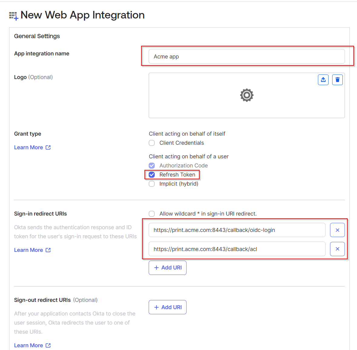 Callback domain for custom application – Select from the list of available domains the one that you defined in OKTA administration UI as Sign-in redirect URIs. In the above example, it was print.acme.com.