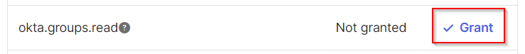 Got to the Okta API Scopes tab. Under Consent, click Any and search for okta.users.read and okta.groups.read. Select Grant for both.