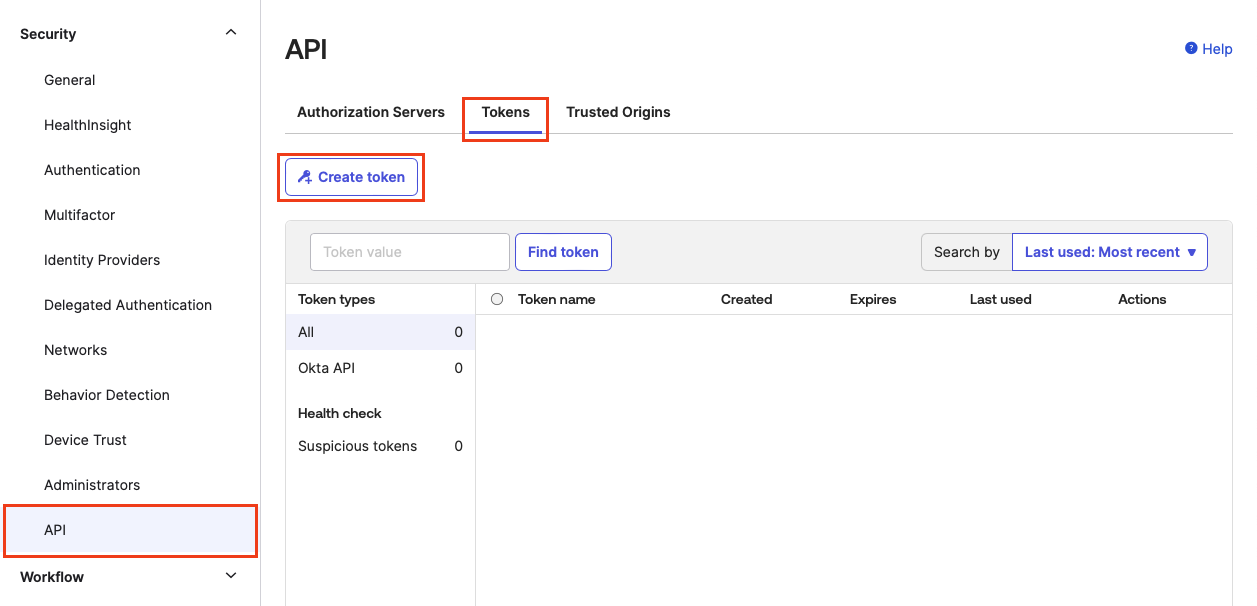 In the main menu, go to Security > API. Click the Tokens tab and then click Create token.
