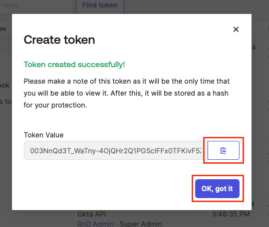 Copy the Token value. Save the secret value in a secure way. You will need it later on in CloudStream Authentication provider configuration form. Click OK, got it to proceed.