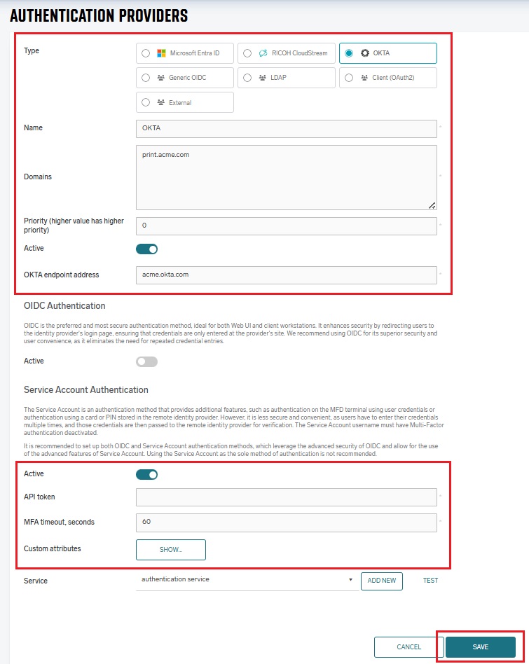 Configuring an authorization provider with both OIDC and service account can be useful in situations where you require enhanced security and user convenience in logging into CloudStream, as well as allowing users to log in at the MFDs with cards or PINs.