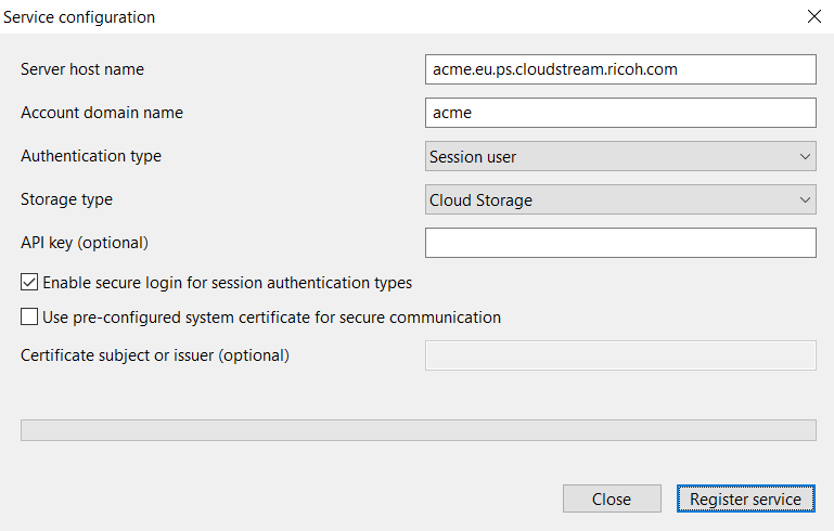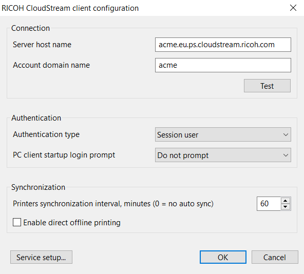 Account domain name – domain name of the customer account configured on CloudStream server. If not specified it will be inferred from the gateway address setting. If RICOH CloudStream Client is running in local storage mode this option can only be changed via the Service setup button.