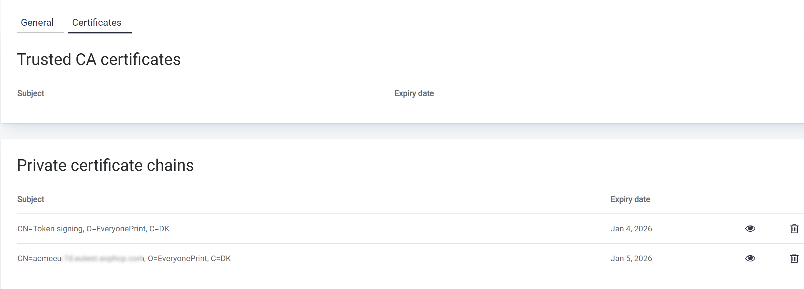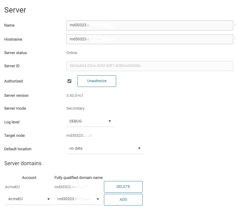 In the Server domains section, choose the IP address or domain name from the FQDN drop-down list that you've previously entered in the Customer account section. After your selection, click Add. If the row is created correctly, the Add button will change to Delete button. This is what the page will look like before saving: