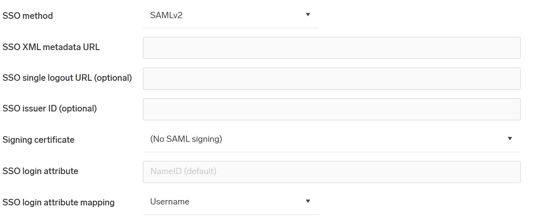 In SSO method, select SAMLv2 to enable SSO. Select None to disable SSO. There is no need to add values for the SSO XML Metadata URL if SSO method is None.