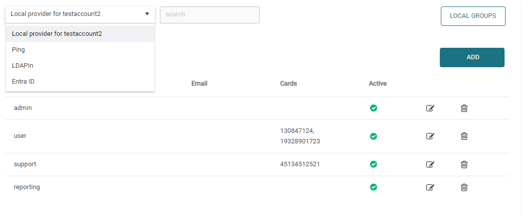 Choose the authentication provider at the top and enter even a partial username or card id to perform a search. Then click to edit the user, to manually modify attributes such as a specific user's password, short ID’s or card ID’s. To edit card ID’s list, you must have the CardManagement permission.