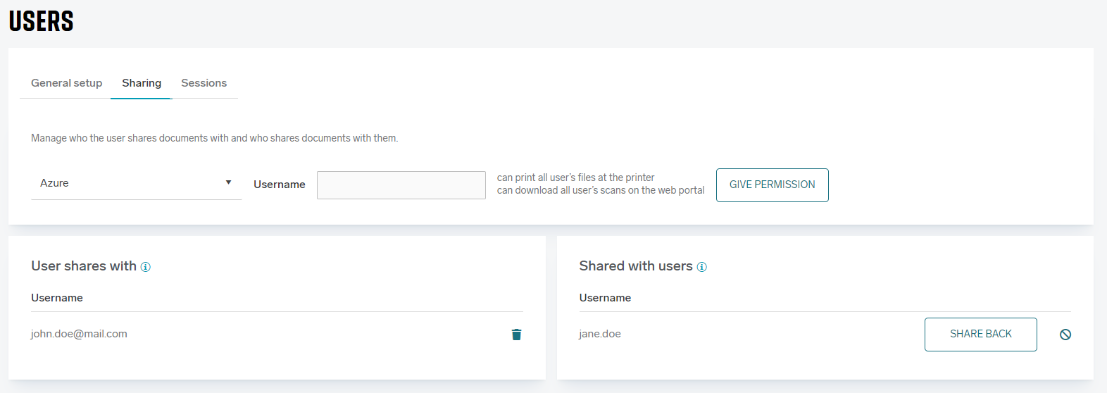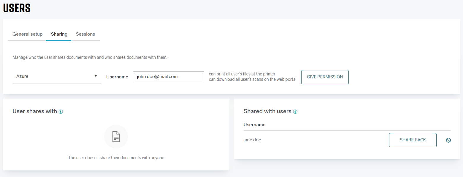In the Sharing tab you can, while editing the user, add sharing permission to other users, so they can see and print/download this user documents/scans.