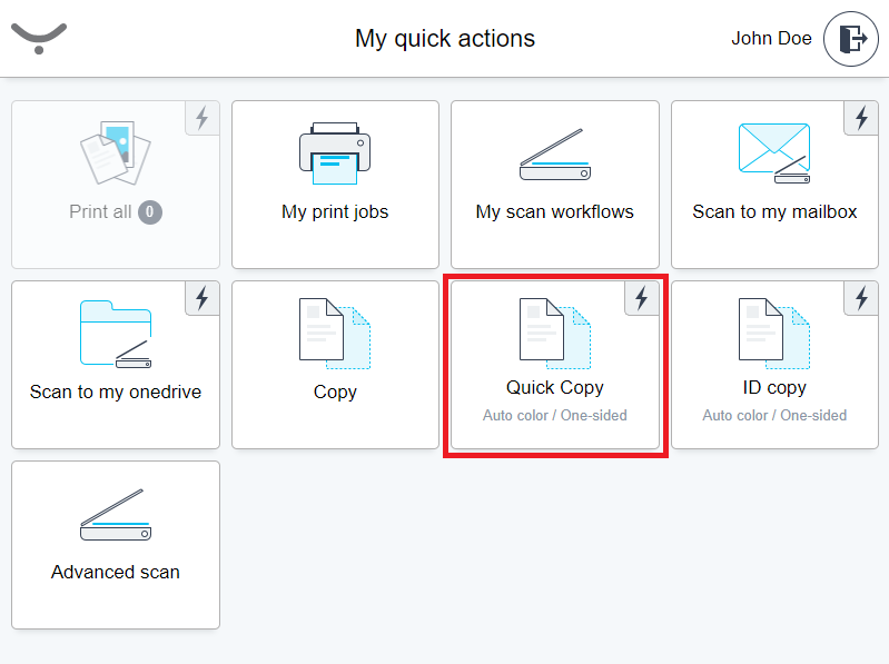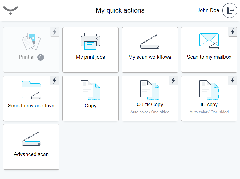My quick actions application enables you to access frequently used functions, such as print all jobs or use a scan workflow immediately after logging in. The quick action buttons are displayed according to your rights and scan workflows assigned to you.If a button has a small flash icon in the top-right corner, it means that the action will be executed immediately after you tap the button. No other screen or confirmation action will be displayed.