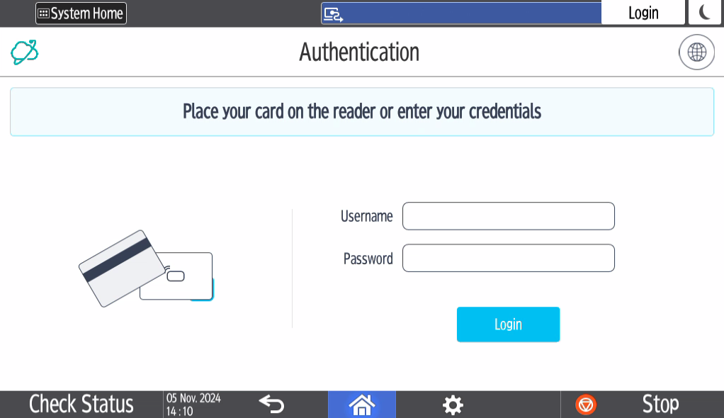 The authentication method depends on how your administrator configured the terminal. You can log in via card, PIN (Short ID), username/password, or their combinations. Follow the instructions on the screen.