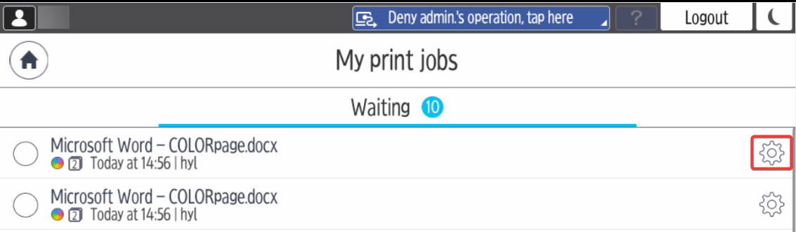 To modify the finishing options (Color, Sides, and Number of copies) before printing, tap the cogwheel icon next to the job.