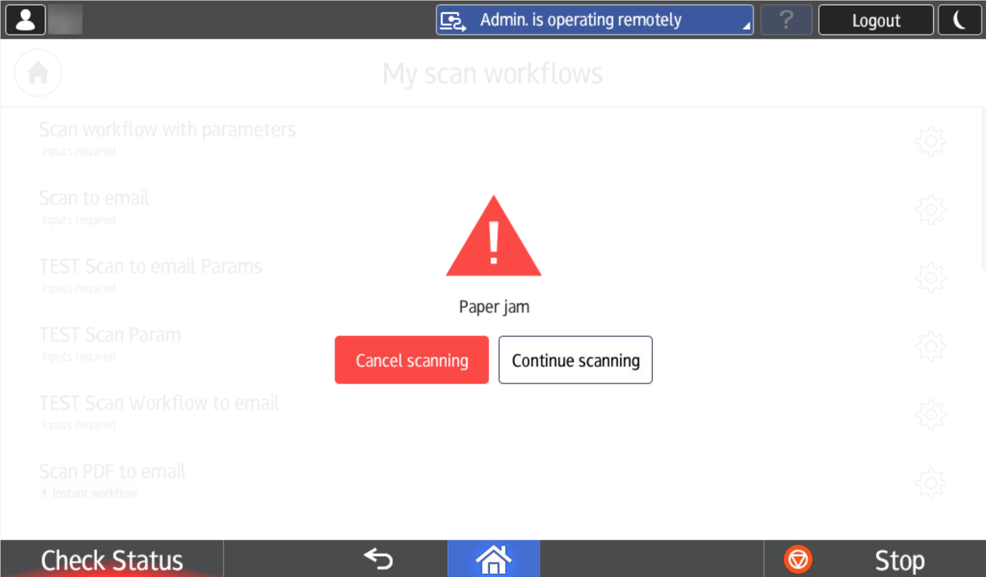After removing the jammed paper, you can cancel the scan job by tapping Cancel scanning or continue the scanning by tapping Continue scanning.