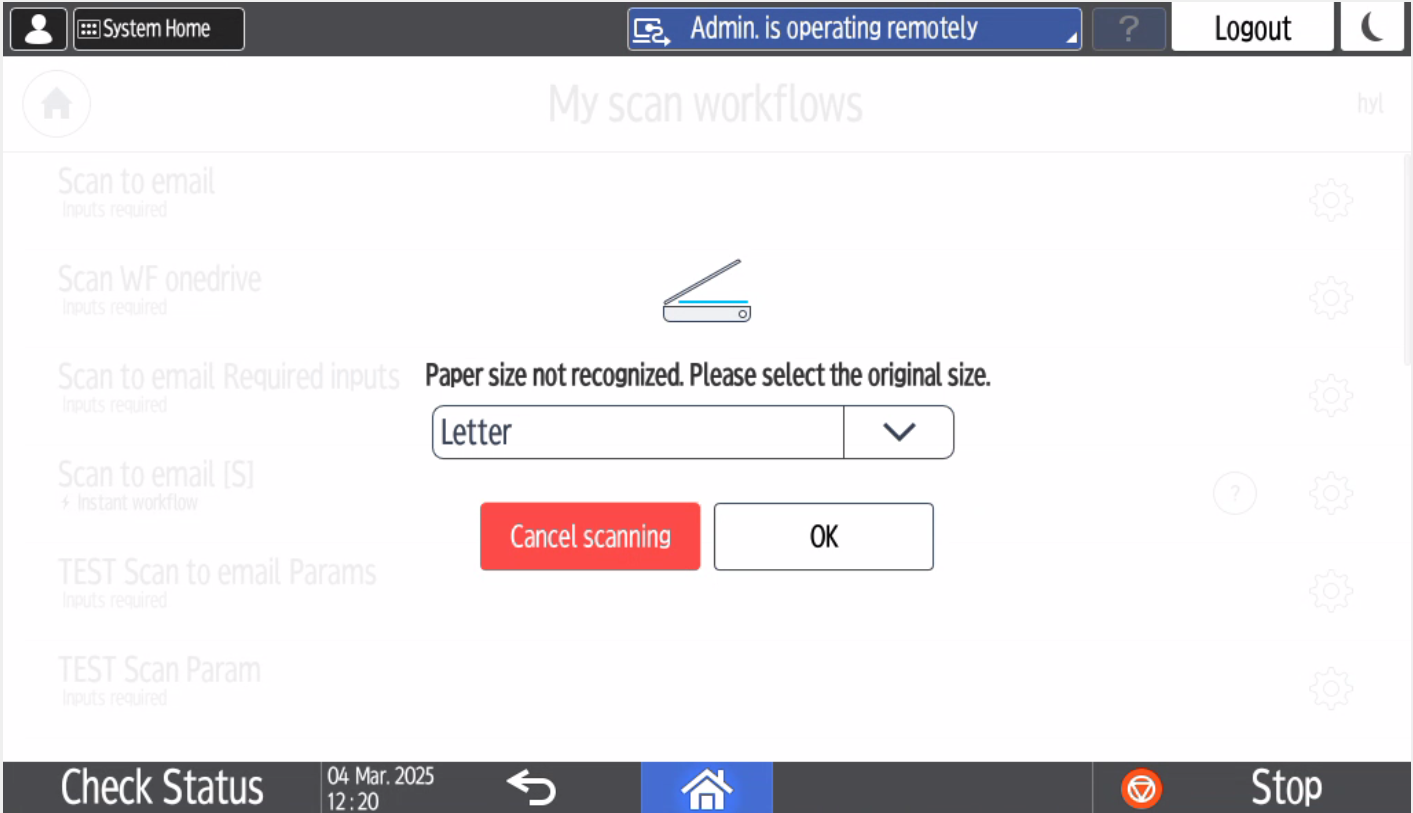 If the size of the paper on the glass is not recognized, you will see the option to select it manually. Tap OK to continue scanning. There is also possibility to cancel the scan job by Cancel scanning button.