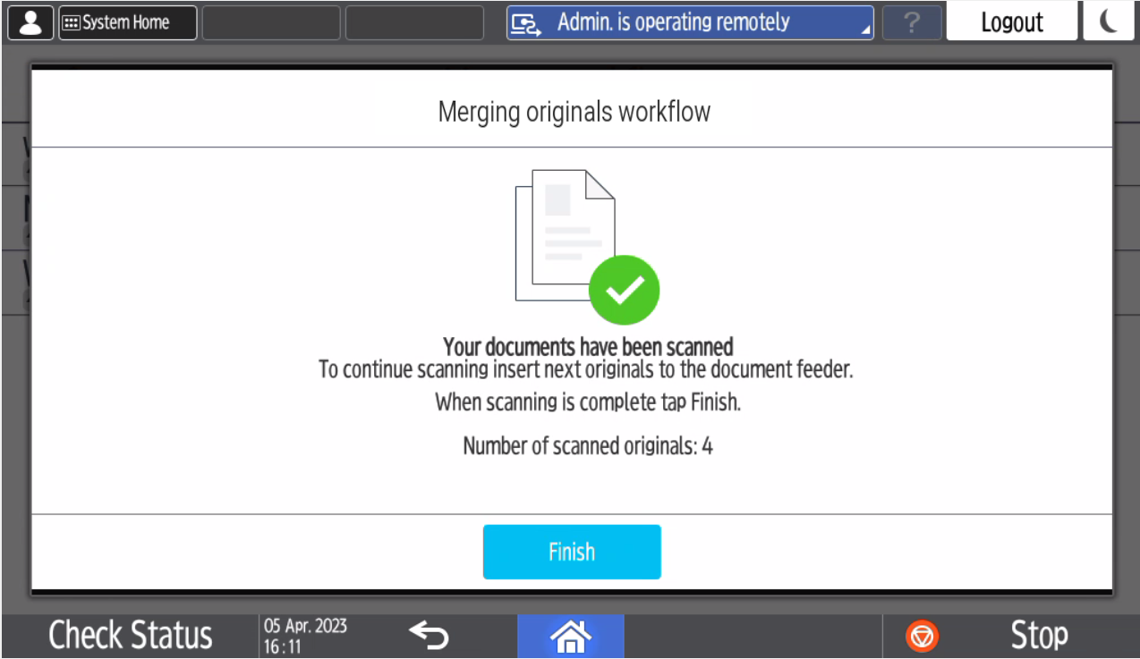 While scanning, you will see the Scanning workflow in progress screen. When scanning from glass or having Merging originals enabled, the following screen will be displayed when the scanning is finished.