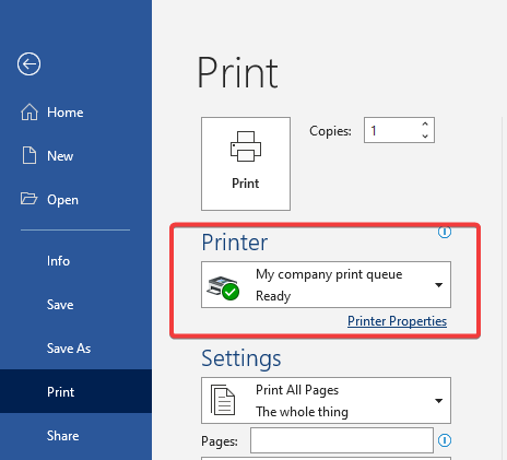 You will see all print queues (printers) that your administrator made available to you in your operating system. Select one of the queues in the print dialogue when printing a document from your chosen application.