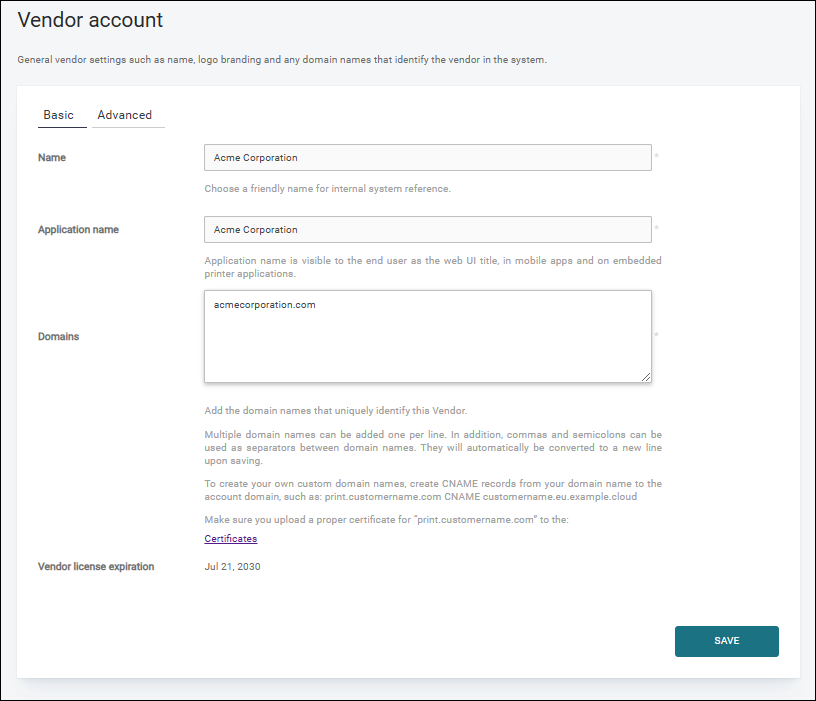 Default domain for new accounts – Available only for Vendor accounts. The subdomain that all new Vendor or Customer accounts created under this new Vendor account will receive. The format is <account>.<Default domain for new accounts>. Make sure that the cloud server contains a correct wildcard certificate and that your DNS points correctly to the cloud.