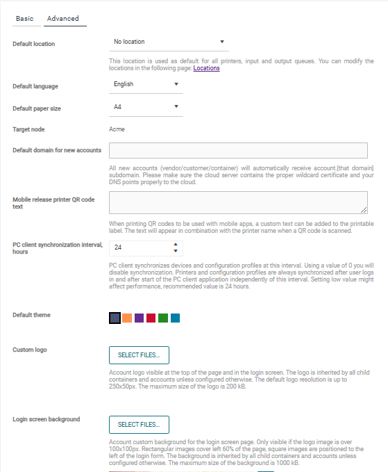 Default color mode – Color mode for default Configuration profile. Note: This setting serves only for creating default profile during customer creation and will not be visible once customer has been created.