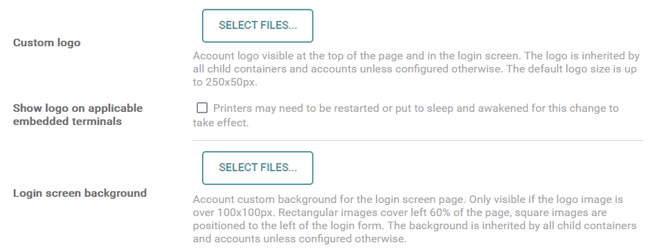 Show logo on applicable embedded terminals – Check the checkbox so the image uploaded in Custom logo appears also in the upper left corner of an installed Embedded Terminal.