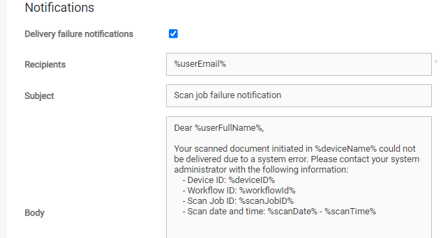 Use variables to customize your workflows further by allowing dynamic information to be included in the workflow process. For example, if a workflow involves scanning documents and sending them via email, you can use variables such as %userEmail% and %userFullName% to automatically populate the recipient fields with the email and name of the user who initiated the scan. Similarly, you can use variables such as %deviceName% and %deviceID% to identify the device where the scan was made, which can be useful for tracking purposes.